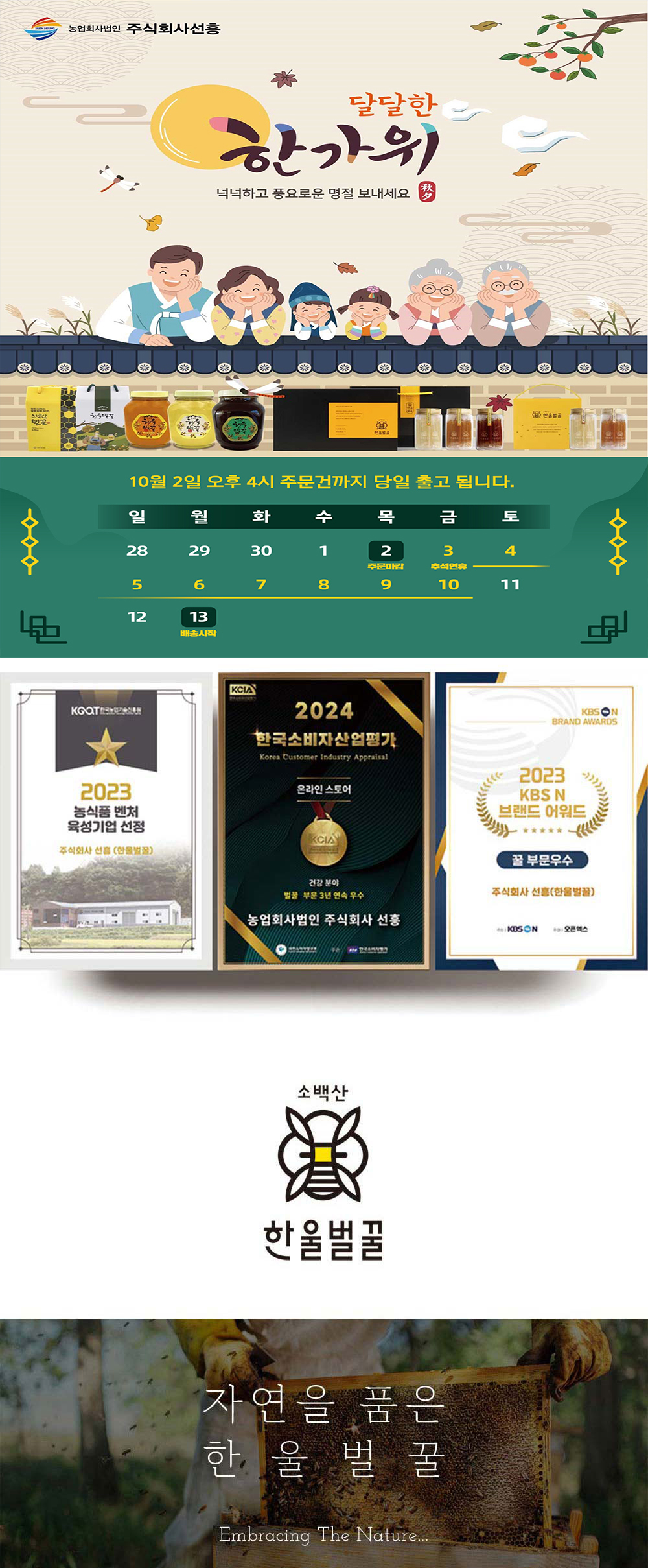 소비자산업평가 벌꿀부문 소비자만족도상 수상 1) 22년~24년 3년연속 한국소비자 산업평가 벌꿀부문 1위 2) 2023년 농식품 벤처 육성기업 선정