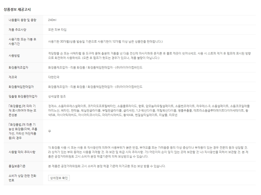 7. 「화장품법」에 따라 기재ㆍ표시하여야 하는 모든 성분 : 상품상세참고