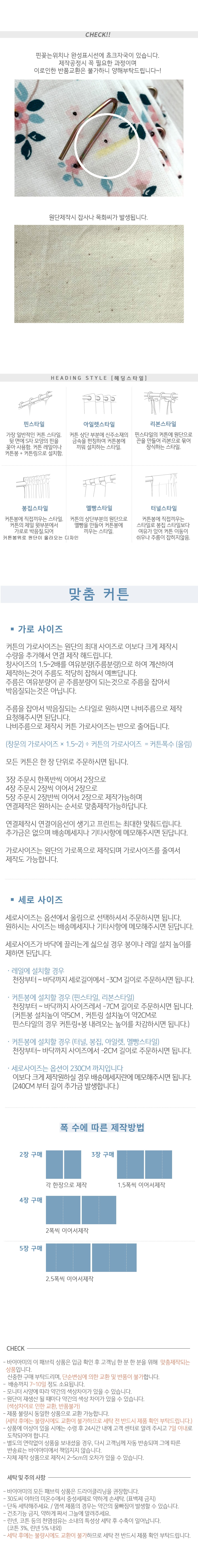 터널스타일로 제작시 커튼봉높이2cm 차감 핀스타일로 제작시 레일은3cm차감 핀스타일로 제작시 커튼봉+커튼링높이 7~8cm차감 멜빵스타일로 제작시 커튼봉높이2cm차감 (일반커튼봉기준입니다. 압축봉은 제외입니다.)