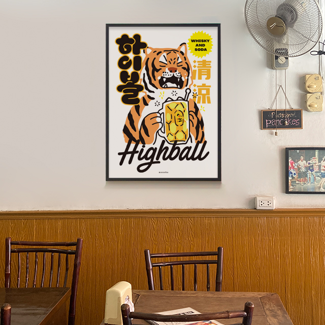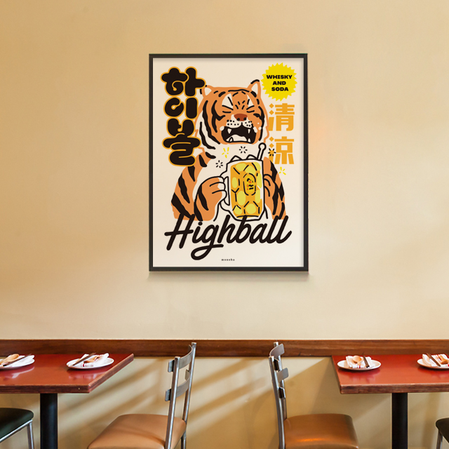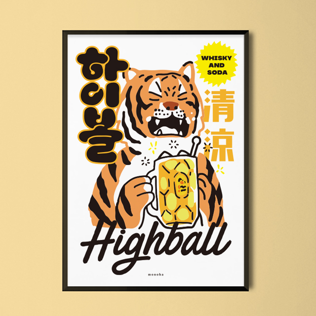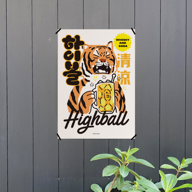 하이볼을 마시며 호탕하게 웃는 호랑이를 그린 일러스트 포스터입니다.