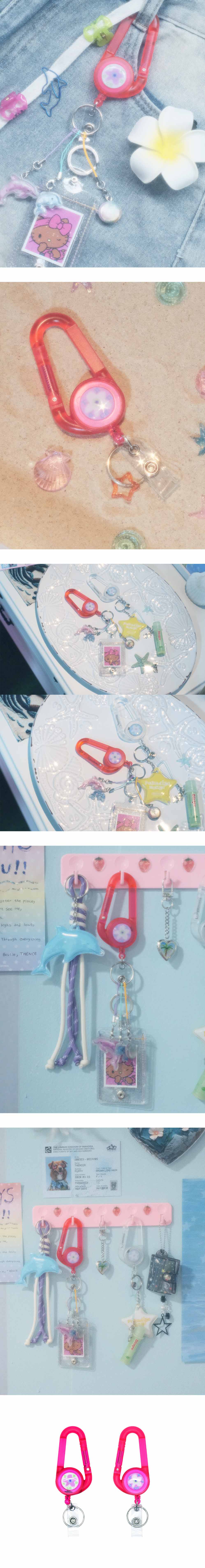 Size : Carabiner - 4 x 7.5 (cm), All - 4 x 12 (cm) / Material : Plastic, Epoxy, Metal, PVC / Color : Clear / Quantity : 1 ea / Made In China - 꽃 포인트가 매력적인, 가벼운 플라스틱 소재의 카라비너입니다. - 군더더기 없는 심플한 형태와 소재감이 돋보이는 제품으로, 하단에는 릴이 함께 구성되어 있어 활용도가 높습니다. - 카라비너 단독으로는 물론, 릴을 활용한 카드지갑이나 파우치와 믹스해도 모두 매력적으로 사용할 수 있습니다. |