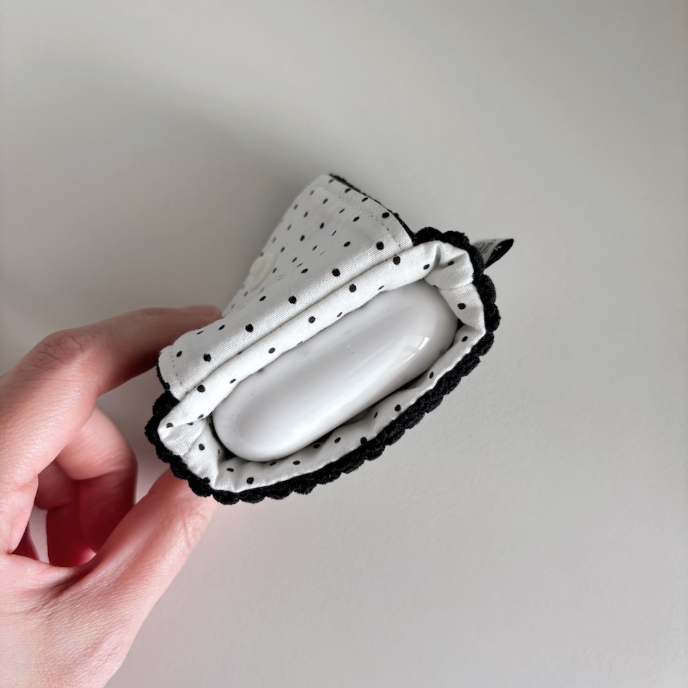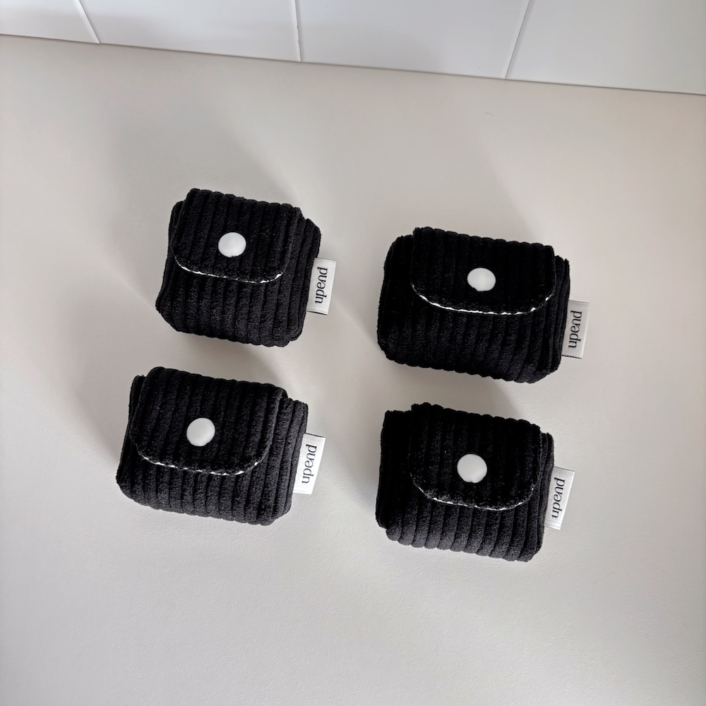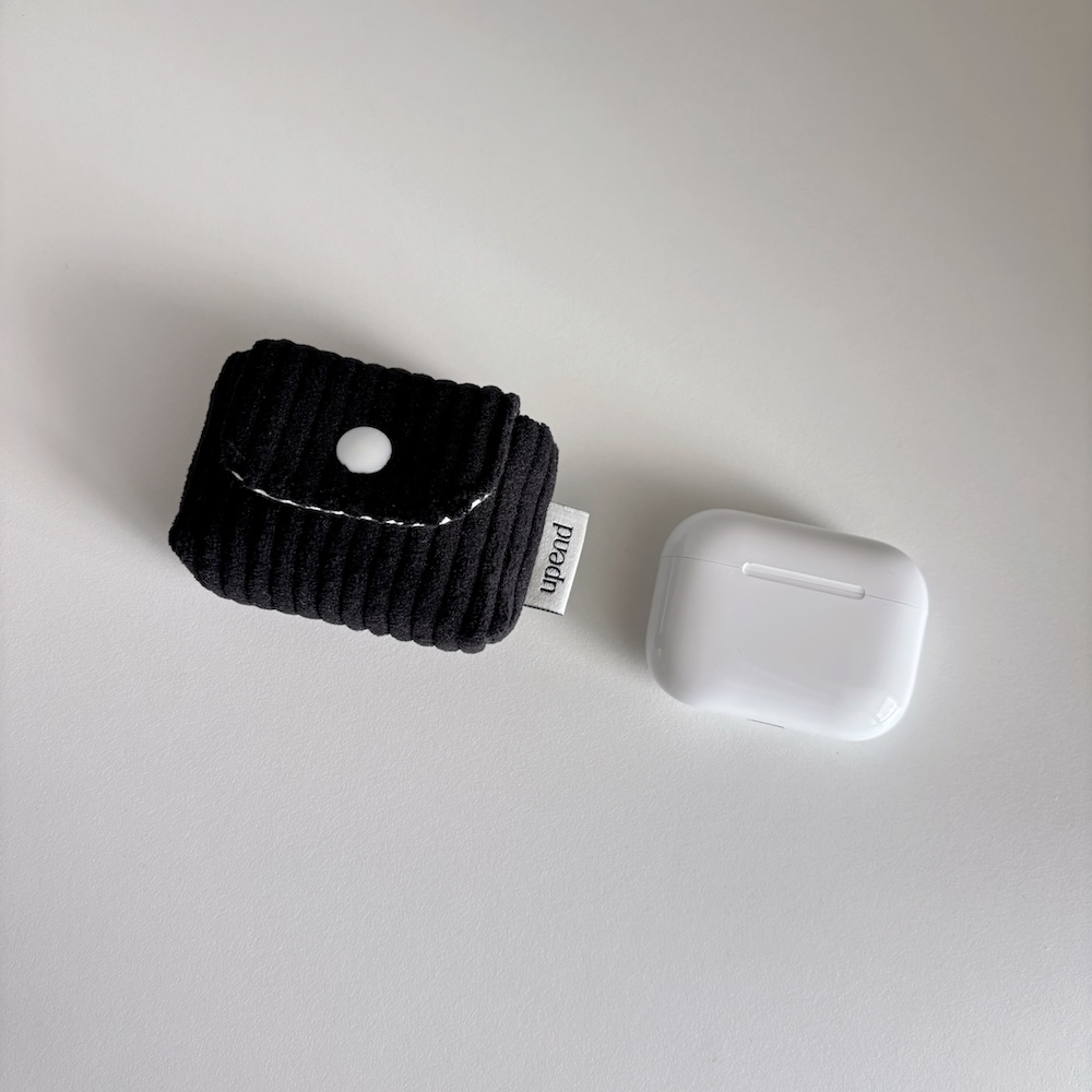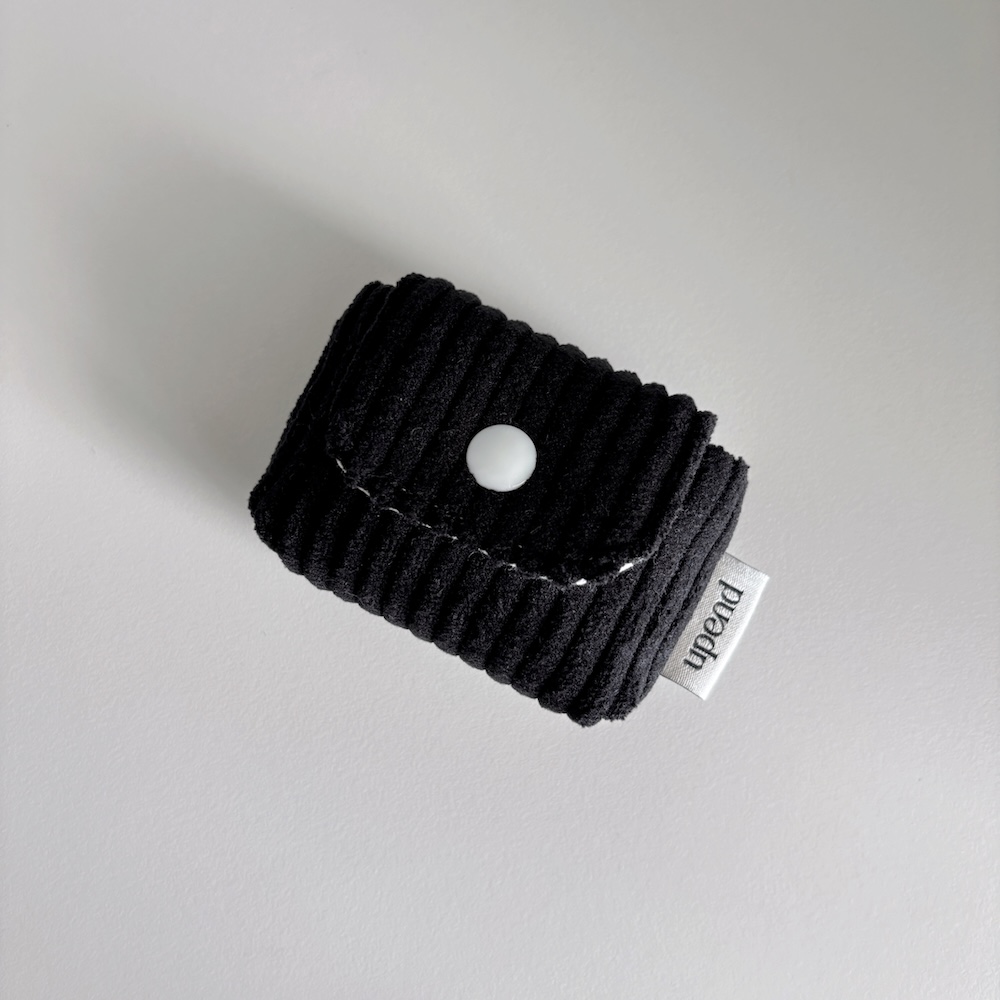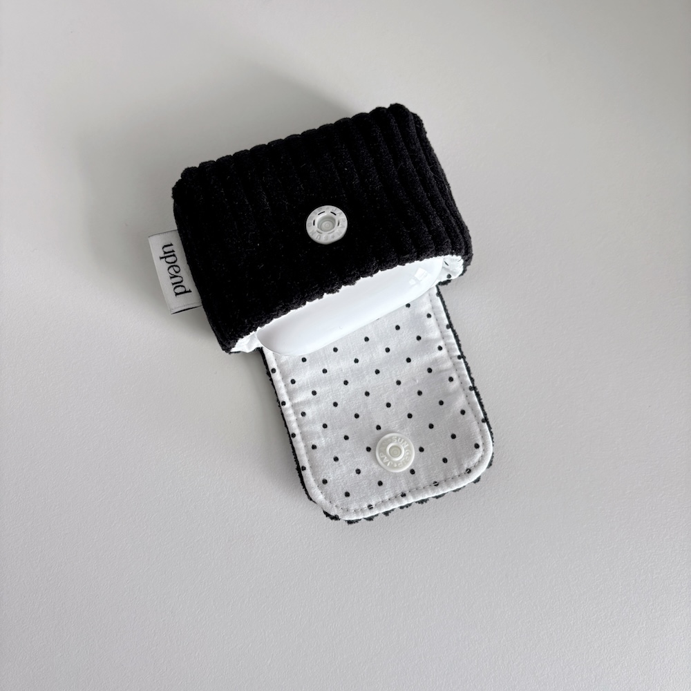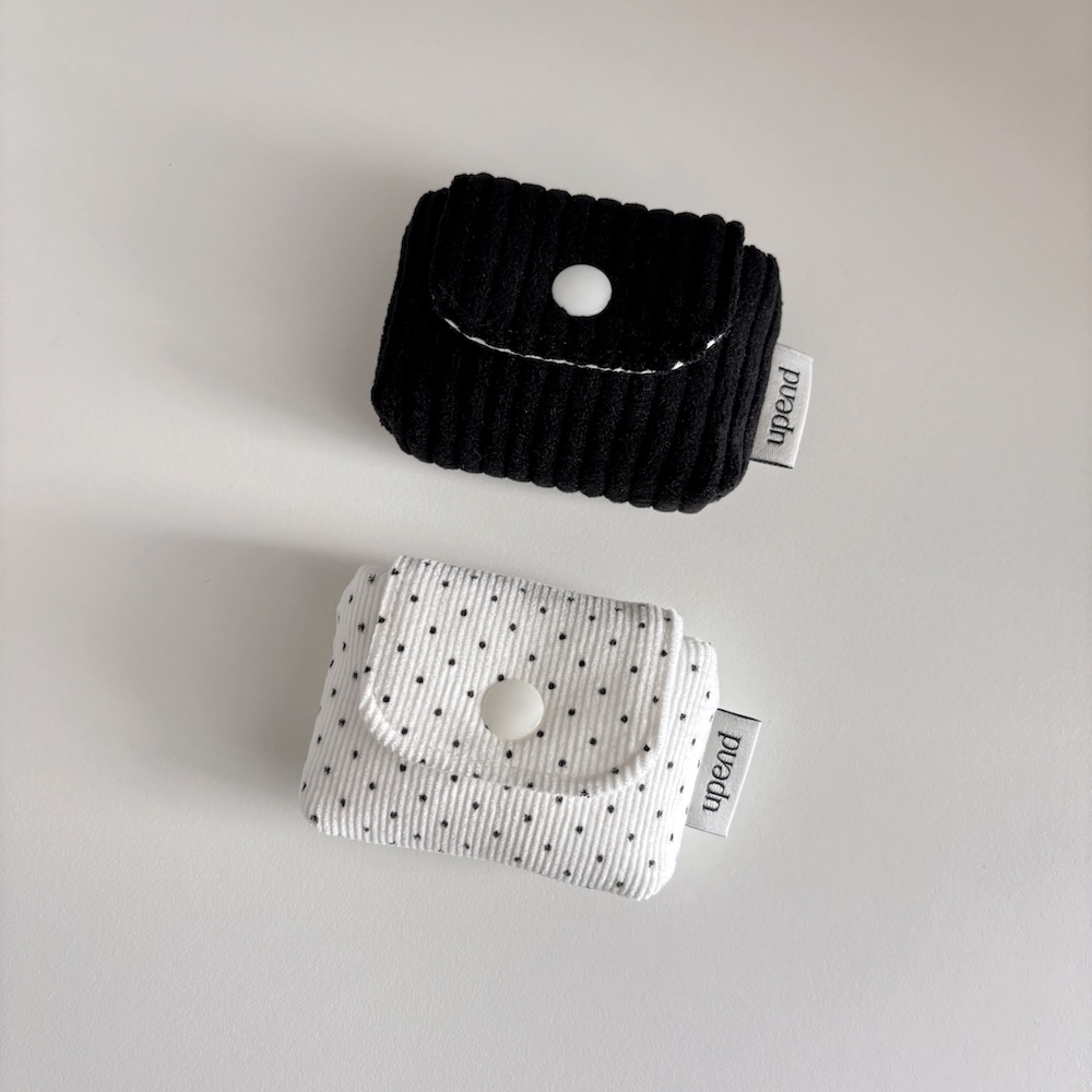 | corduroy mini pouch 에어팟을 넣을 수 있는 크기로 만들어진 미니 파우치 입니다. 안감은 도트 원단을 매치하여 포인트를 주었습니다. *케이스 미착용 상태로 넣을 수 있는 크기입니다. size 가로 X 높이 X 폭 (cm) airpods 1,2 : 5 X 5.5 X2.4 airpods 4 : 5.5 X 5 X 2.4 airpods 3 : 6 X 5 X 2.4 airpods pro : 6.5 X 5 X 2.4 color : black material : corduroy / cotton |