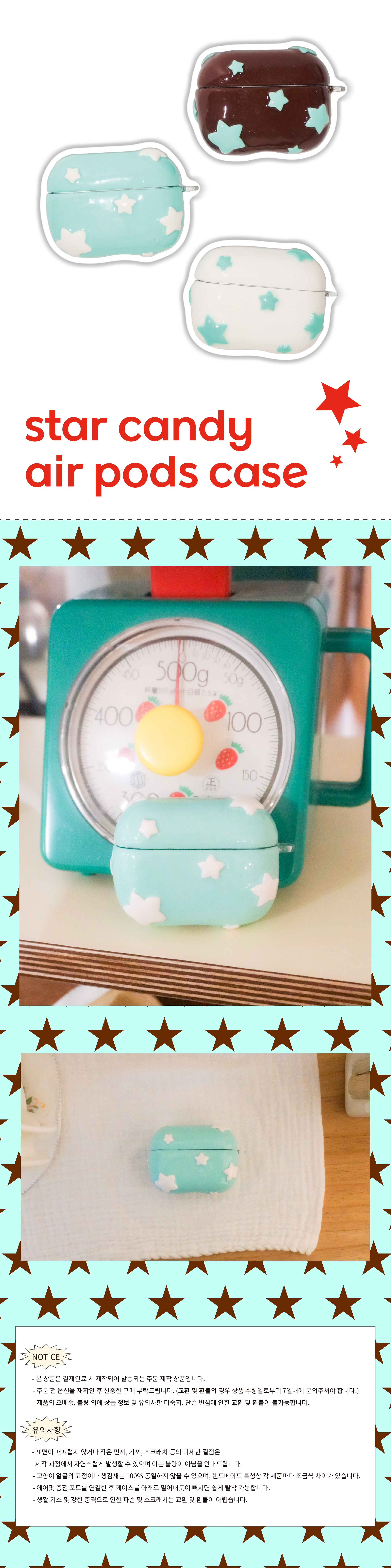 ??제작 기간을 꼭 확인해주세요! * 본 상품은 제작 및 배송에 7 - 14일 (??주말, 공휴일 제외)이 소요됩니다. 본 상품은 결제완료 시 제작되어 발송되는 주문 제작 상품입니다. 주문 전 옵션을 재확인 후 신중한 구매 부탁드립니다. 교환 및 환불의 경우 상품 수령일로부터 7일 이내 문의주셔야 합니다. 제품의 오배송, 불량 외에 상품 정보 및 유의사항 미숙지, 단순 변심에 인한 교환 및 환불이 불가능합니다. 핸드메이드 제품 유의사항 ? 표면이 매끄럽지 않거나 작은 먼지, 기포, 스크래치 등의 미세한 결점은 공정상 발생할 수 있는 자연스러운 현상이며 이는 불량이 아님을 공지해드립니다. ? 고리가 있습니다. ? 에어팟 충전 포트를 연결한 후 케이스를 아래로 밀어내듯이 빼시면 쉽게 탈착이 가능합니다. ? 생활 기스 외에 강한 충격으로 파손 및 스크래치가 날 수 있으며 이로 인한 교환 및 환불이 어렵습니다. |