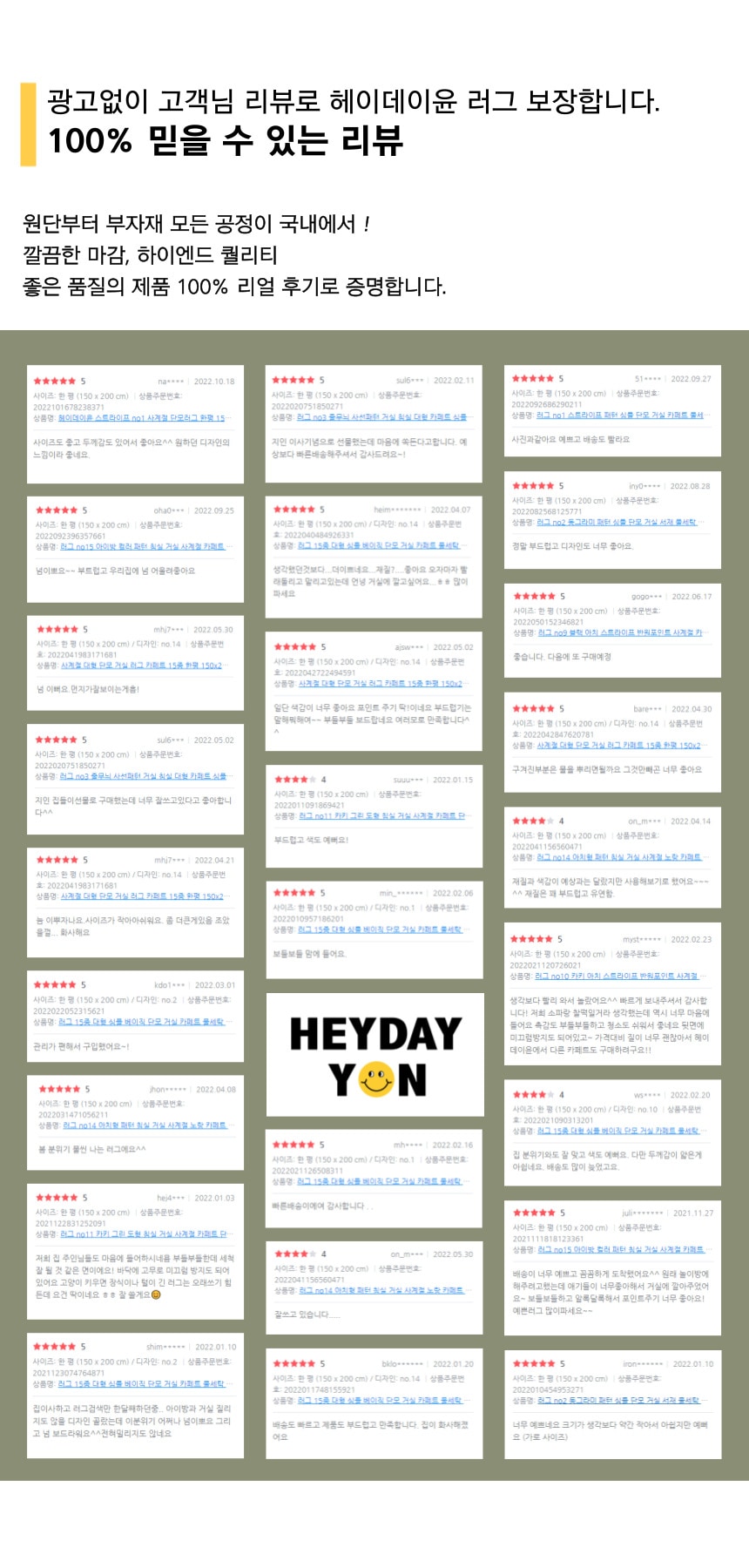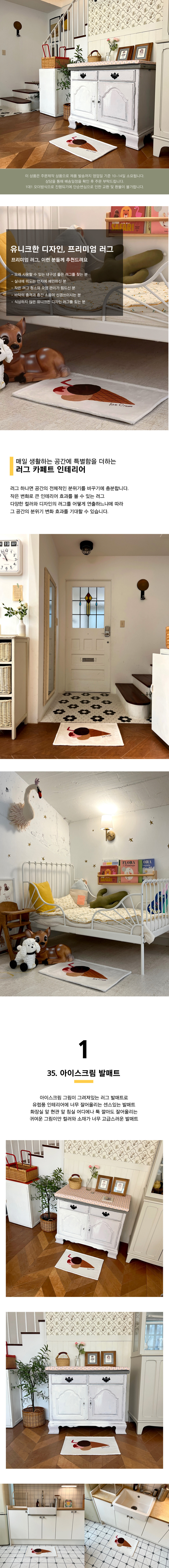 no35. 아이스크림 발매트 아이스크림 그림이 그려져있는 러그 발매트로 매일 생활하는 공간에 특별함을 더하는 러그 카페트 인테리어 러그 하나면 공간의 전체적인 분위기를 바꾸기에 충분합니다. 작은 변화로 큰 인테리어 효과를 볼 수 있는 러그. 다양한 컬러와 디자인의 러그 그 공간의 분위기 변화 효과를 기대할 수 있습니다.를 어떻게 연출하느냐에 따라 유니크한 디자인, 프리미엄 러그 프리미엄 러그, 이런 분들께 추천드려요 - 오래 사용할 수 있는 내구성 좋은 러그를 찾는 분 - 실내에 떠도는 먼지에 예민하신 분 - 작은 러그 청소와 오염 관리가 힘드신 분 - 바닥의 충격과 층간 소음이 신경쓰이시는 분 - 식상하지 않은 유니크한 디자인 러그를 찾는 분 깔끔한 마감처리 깔끔한 마감처리로 올풀림 걱정없이 오래도록 유지됩니다. 100% 국내공장 자업으로 품질의 차이를 부드러운 터치감 고급 폴리에스터 100% 소재로 제작돼 부드럽고 포근함을 느낄 수 있어요. 가벼운 단모 스타일 러그로 사계절 사용이 가능합니다. pvc 미끄럼방지 뒷면 전체에 pvc 소재로 미끄럼방지 처리가 되어있어 밀림없이 안전하게 사용가능합니다. 쉽고 편리한 관리 고급 폴리에스터 100% 소재로 제작돼 부드럽고 포근함을 느낄 수 있어요 세탁기 사용이 가능하여 간단하게 접어서 세탁하실 수 있습니다. 후염방식 제작 특성상 부분별로 하얀색 스팟, 부분밀림, 색번짐 현상이 있을 수 있으며 이는 제품의 자연스러운 현상이므로 민감하신 분들은 선염방식으로 제작된 러그를 추천드립니다. WASHING TIP 세탁기 사용가능, 드라이클리닝 가능느껴보세요 단독 물세탁 권장, 표백제 및 섬유유연제 사용 금지 탈수는 약하게, 건조기 사용 금지 열에 의한 변형이 있을 수 있어 다리미 사용 금지 DELIVERY 러그 카페트는 접어서 배송됩니다. 1주일 정도 사용하시면 자연스레 복원되나 받으신 후 세탁 하시면 접힌 부분없이 유연한 러그를 사용하실 수 있습니다. CARE TIP 청소기 사용으로 먼지나 이물질 제거가 간편합니다. 음식물이나 액체류는 즉시 닦아주시고 적은 오염은 부분세탁을 권장합니다. 소재 - 앞면 : 폴리에스터 100% / 뒷면 (바닥) : 논슬립 (PVC 100%) 구성 - 러그 카페트 1장 / 발매트 1장 /원형러그 1장 사이즈 - 150 X 200 cm (±5cm) / 40 X 60 cm (±5cm) / 원형러그 지름 120 cm (±5cm) 제조 - 국내 양주 배송 헤이데이윤의 모든 러그 제품은 주문 후 제작 방식으로 주문 확인 후 영업일 기준 최대 14일 정도 제작기간이 소요됩니다. 이는 최대 제작 기간을 의미하며 제작완료 시 더 빠르게 출고될 수 있습니다. 배송기간은 출고일 기준 2~3일 소요되며 지역과 택배사의 사정에 따라 지연될 수 있습니다. 교환 및 반품 미사용의 경우에 한하여 제품 수령 후 일주일 이내 교환 및 반품이 가능합니다. 오배송 및 사용 전 파손 건은 무료 교환 및 반품 처리해드립니다. 구매자 단순 변심으로 인한 교환 및 반품의 경우 왕복 배송비는 구매자께서 부담하셔야 합니다. 사용한 흔적 (음식물, 섬유유연제 냄새 및 오염 등)이 있을 경우 교환 및 반품이 불가합니다. 고객오더 주문제작 상품 이 상품은 주문제작 상품으로 제품 발송까지 영업일 기준 10~14일 소요됩니다. 1대1 오더방식으로 진행되기에 단순변심으로 인한 교환 및 환불이 불가합니다. |